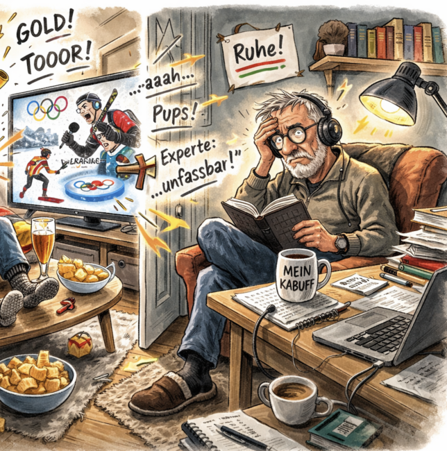 Das Fernsehen verwöhnte uns in dieser Zeit: mit wenigstens fünf Stunden Übertragung von „Curling“ täglich – was keine Sau interessiert, oder mit anderem sportlichen Tinnef. Aber auch mit einem Anflug von sonst im ÖRR verpöntem Nationalismus, wenn sechs Mal am Tag eine Siegerehrung mit Nationalhymne abgespielt wurde, wenn mal ein Deutscher „Gold“ gewann. Man machte auch nationale Hoffnung, auch wenn zu erwartende Versagensleistungen „unserer Athleten“ anstanden, oder eigentlich hoffnungslose Typen aus Deutschland in den Wettstreit traten.